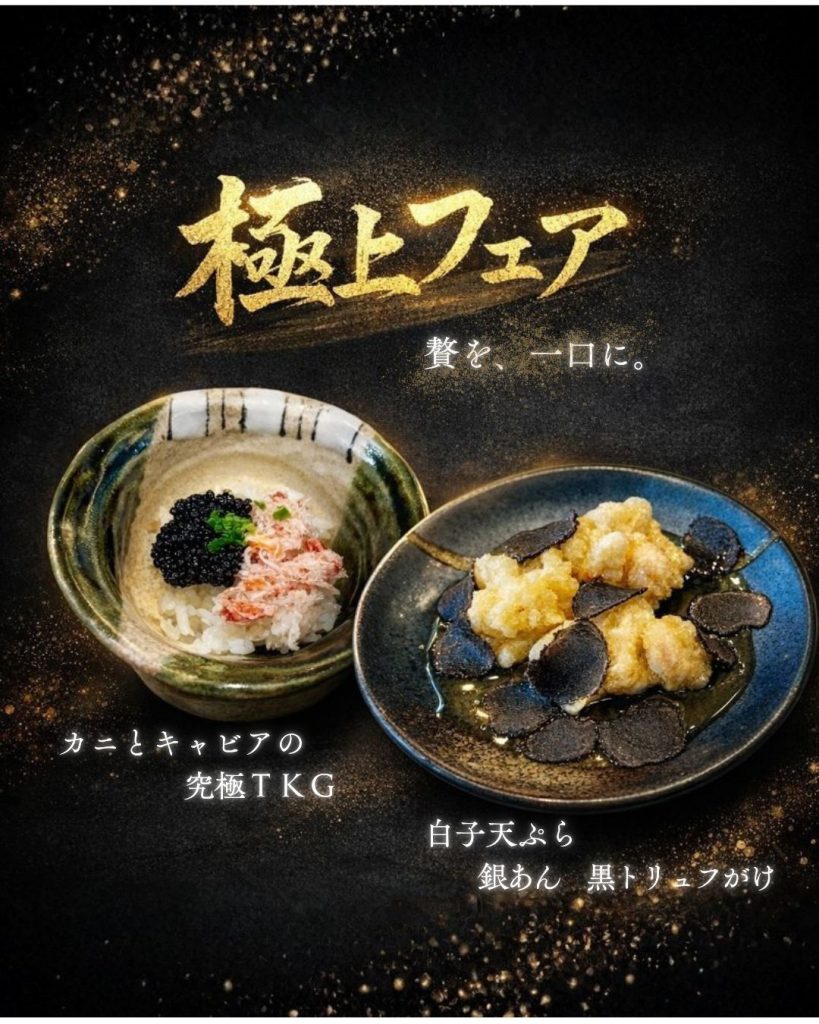 2026.01.21 がってん寿司・承知の助 「極上フェア」のご案内 ◇カニとキャビアの究極TKG ・・・ 1,500円(税抜) ◇白子天ぷら 銀あん 黒トリュフがけ ・・・ 850円(税抜) どちらも数量限定、なくなり次第販売終了となります。